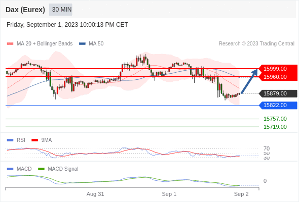 如跌破 15822 ,德国DAX指数期货 (Eurex) 目标方向定在 15757 和 15719 。