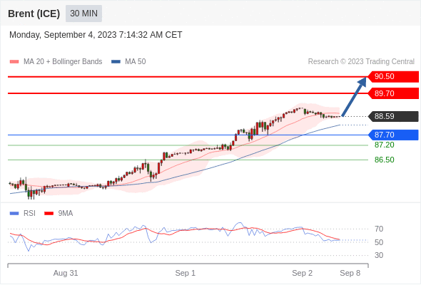 在 87.70 之上,看涨,目标价位为 89.70 ,然后为 90.50 。
