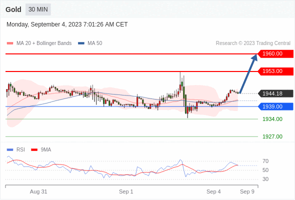 在 1939.00 之上,看涨,目标价位为 1953.00 ,然后为 1960.00 。