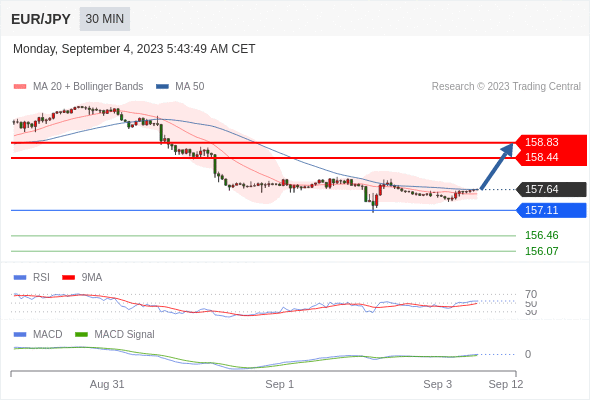 欧元/日元 当日内: 看涨,当 157.11 未被跌破。