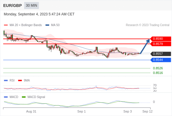 欧元/英镑 当日内: 有上涨的可能,目标价位定在 0.8590 。