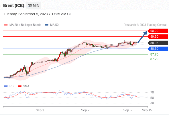 布伦特原油 (ICE)? (X3)? 当日内: 在88.30之上,看涨。