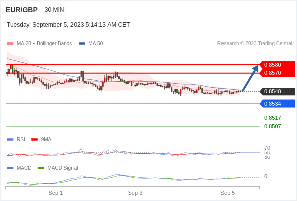 欧元/英镑 当日内: 有上涨的可能,目标价位定在 0.8580 。