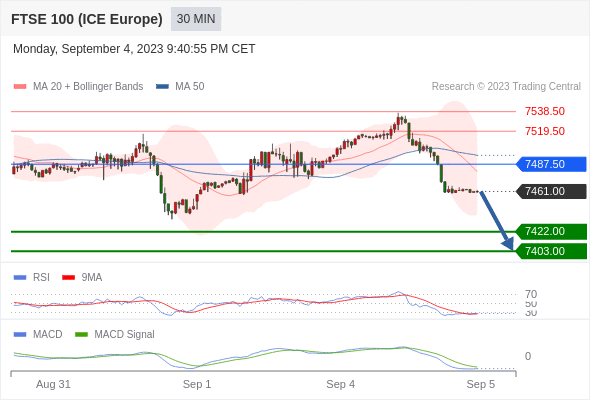 英国富时100指数期货 当日内: 看跌,在 7487.50 之下。