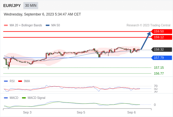 欧元/日元 当日内: 看涨,当 157.79 为支撑位。