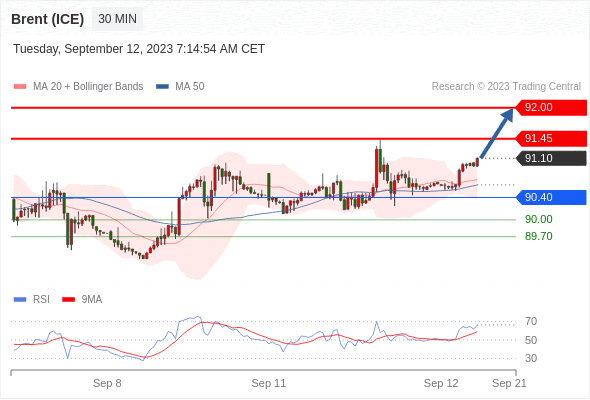 布伦特原油 (ICE)? (X3)? 当日内: 目标位为92.00。