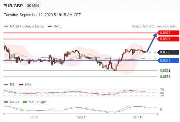 欧元/英镑 当日内: 看涨,当 0.8576 为支撑位,目标定在0.8617。