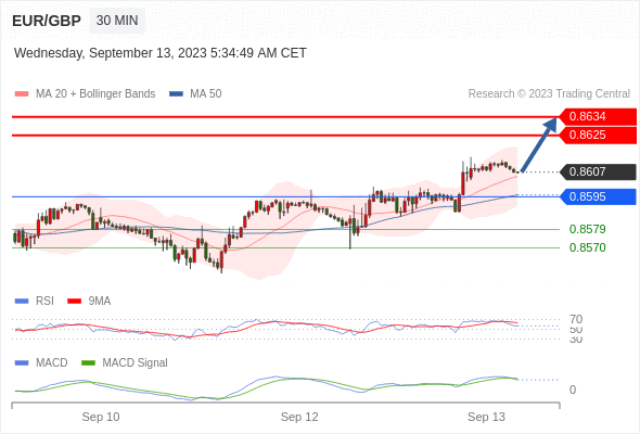 RSI技术指标超过50。 MACD技术指标呈现看多状态并 处在其信号线的下方。 此外,价位处在其20天及50天移动平均线上方 ( 当前是 0.8605 和 0.8596 )。