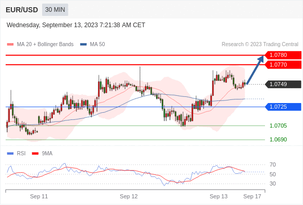 在 1.0725 之上,看涨,目标价位为 1.0770 ,然后为 1.0780 。