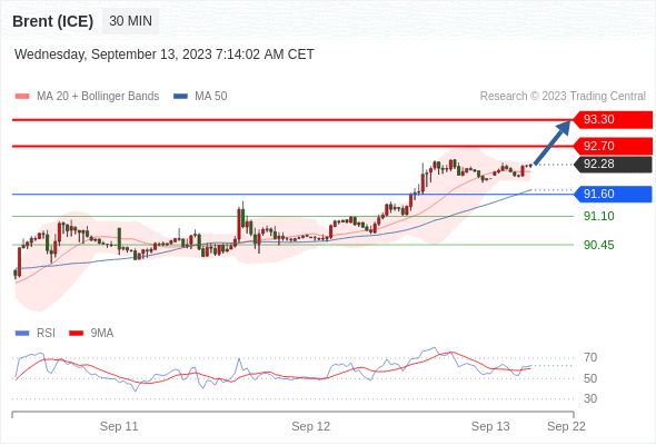 布伦特原油 (ICE)? (X3)? 当日内: 在91.60之上,看涨。