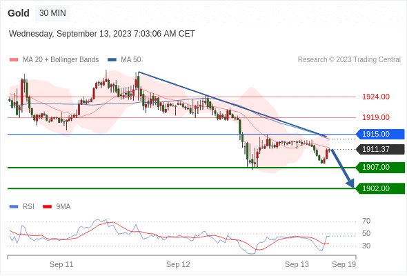 在 1915.00 之下,看跌,目标价位为 1907.00 ,然后为 1902.00 。