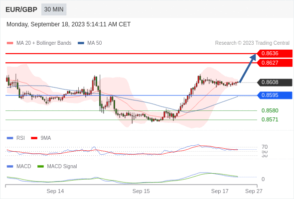 欧元/英镑 当日内: 看涨,当 0.8595 为支撑位,目标定在0.8636。