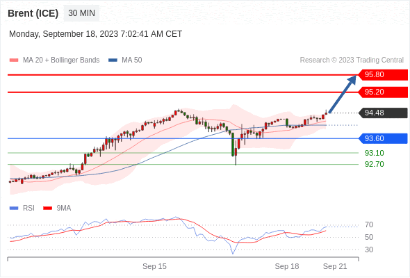 在 93.60 之上,看涨,目标价位为 95.20 ,然后为 95.80 。