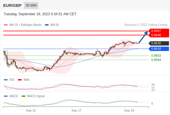 欧元/英镑 当日内: 看涨,当 0.8618 为支撑位,目标定在0.8657。