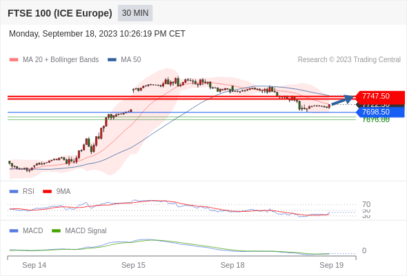 如跌破 7698.50 ,英国富时100指数期货 目标方向定在 7684.50 和 7676 。