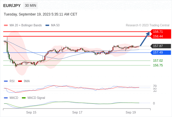 欧元/日元 当日内: 看涨,当 157.49 为支撑位,目标定在158.71。