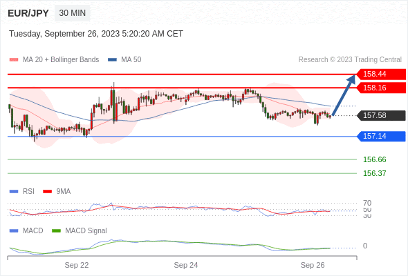 欧元/日元 当日内: 有上涨的可能,目标价位定在 158.44 。