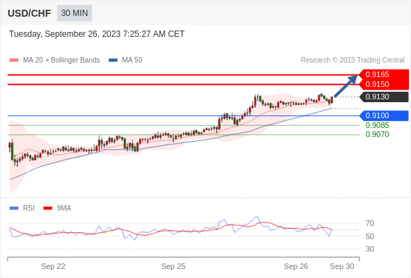 在 0.9100 之上,看涨,目标价位为 0.9150 ,然后为 0.9165 。