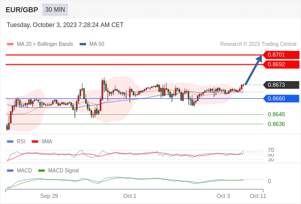 欧元/英镑 当日内: 看涨,当 0.8660 为支撑位。
