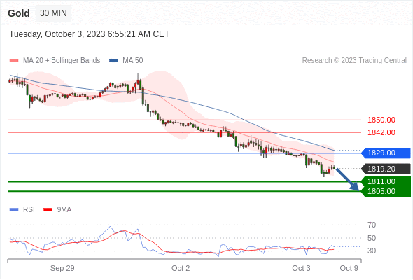 在 1829.00 之下,看跌,目标价位为 1811.00 ,然后为 1805.00 。