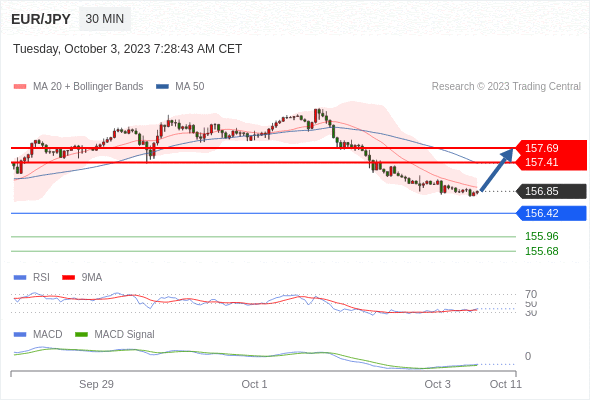 欧元/日元 当日内: 有上涨的可能,目标价位定在 157.69 。