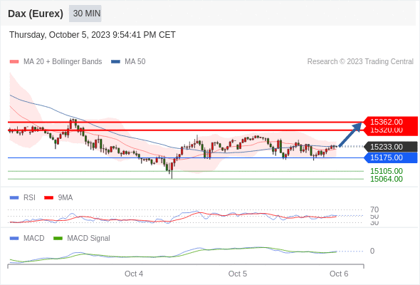 如跌破 15175 ,德国DAX指数期货 (Eurex) 目标方向定在 15105 和 15064 。