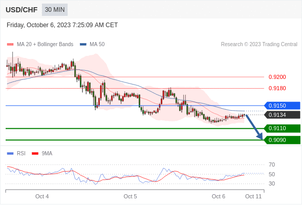 在 0.9150 之下,看跌,目标价位为 0.9110 ,然后为 0.9090 。