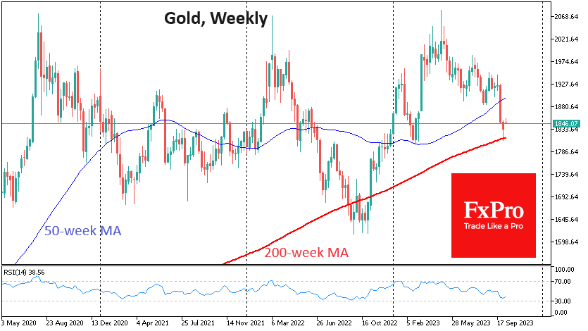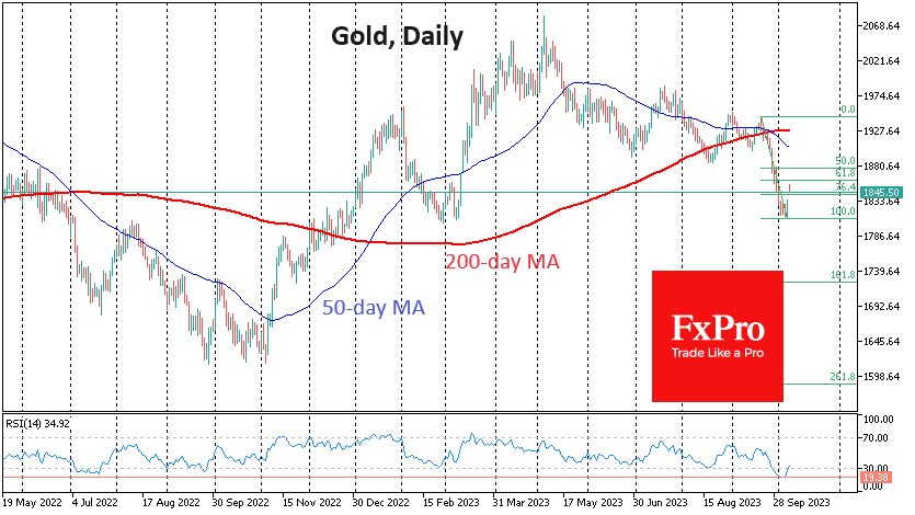 FxPro高级分析师Alex Kuptsikevich指出:上周五开盘时,黄金已经形成了令人印象深刻的超卖状况,自20日以来几乎每天都在下跌,下跌了7%,跌至1810美元附近的低点。这种抛售使日相对强弱指数到达19,这是2015年7月出现的极度超卖水平。当RSI低于30时,资产被认定为是超卖的,而低于20是一种罕见的事件,至少会出现短期反弹。