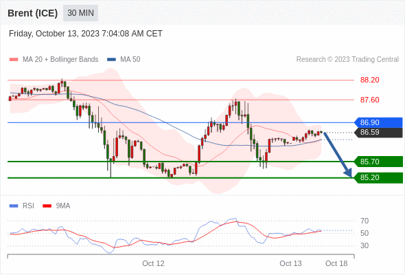 布伦特原油 (ICE)? (Z3)? 当日内: 短期关键阻力位在86.90。