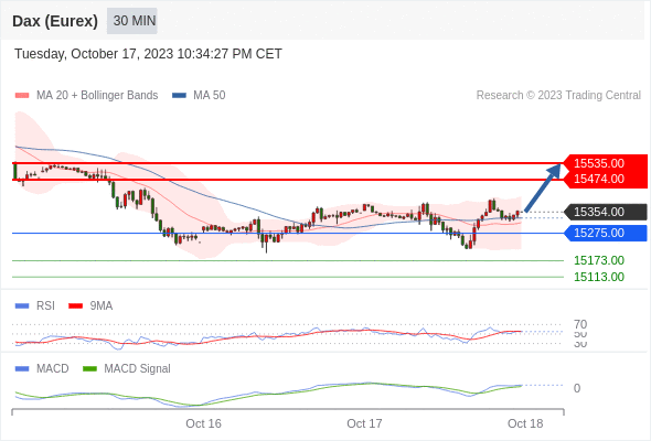 RSI技术指标超过50。 MACD技术指标处在其信号线之上 看多。 此外,价位高于其20个时期及50个时期移动平均线 ( 分别位于 15314.70 和 15331.76 )。