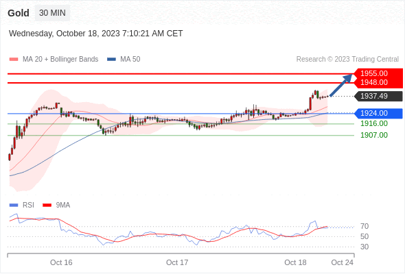 在 1924.00 之上,看涨,目标价位为 1948.00 ,然后为 1955.00 。