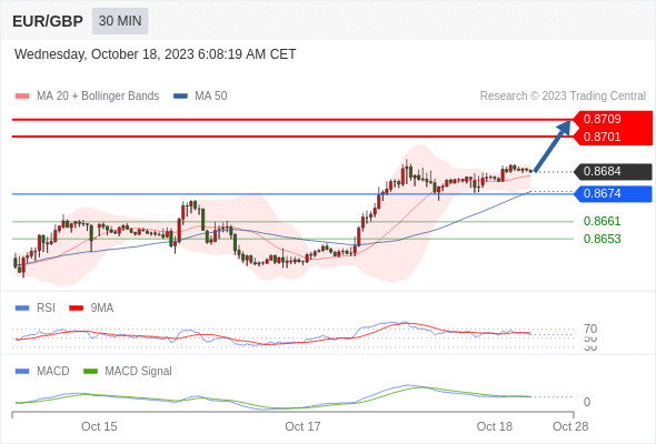 RSI技术指标超过50。 MACD技术指标呈现看多状态并 处在其信号线的下方。 此外,价位处在其20天及50天移动平均线上方 ( 当前是 0.8683 和 0.8675 )。
