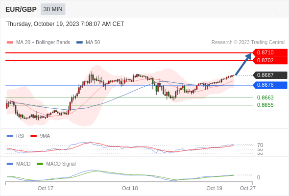 欧元/英镑 当日内: 看涨,当 0.8676 为支撑位。