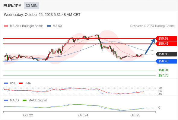 欧元/日元 当日内: 看涨。