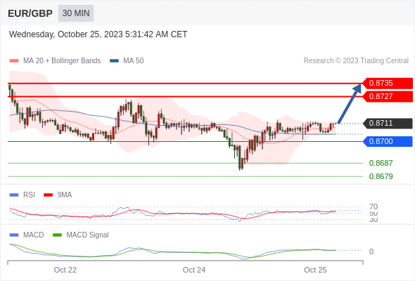 欧元/英镑 当日内: 看涨,当 0.8700 为支撑位。