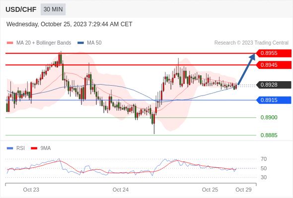 在 0.8915 之上,看涨,目标价位为 0.8945 ,然后为 0.8955 。