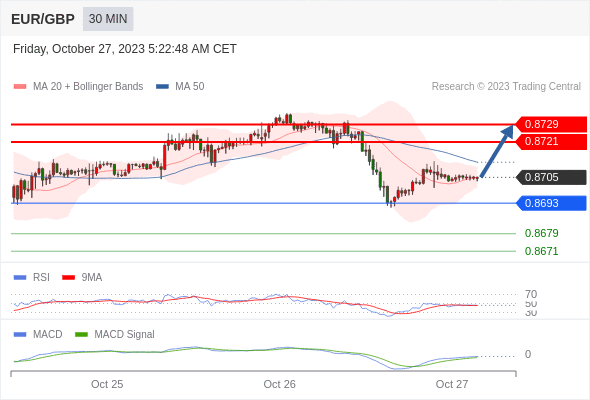 欧元/英镑 当日内: 有上涨的可能,目标价位定在 0.8729 。