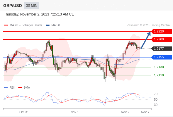 在 1.2155 之上,看涨,目标价位为 1.2200 ,然后为 1.2220 。
