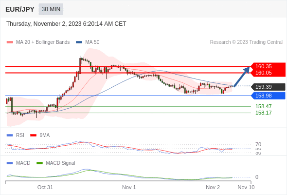 RSI技术指标超过50。 MACD技术指标处在其信号线之上 看空。 此外,价位处在其20天及50天移动平均线下方 ( 当前是 159.40 和 159.46 )。