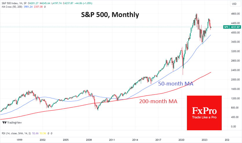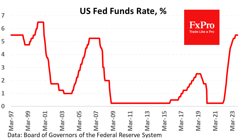 美联储上一次将关键利率维持在5.25%的峰值(当时的水平,而不是区间)是在2006年6月至2007年8月。宽松周期的开始是由于抵押贷款危机导致的银行业的裂缝。随后,宽松政策将市场涨势延续了几个月,但随之而来的是长达一年半的崩盘。