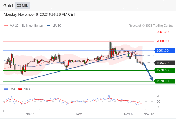 在 1993.00 之下,看跌,目标价位为 1978.00 ,然后为 1970.00 。
