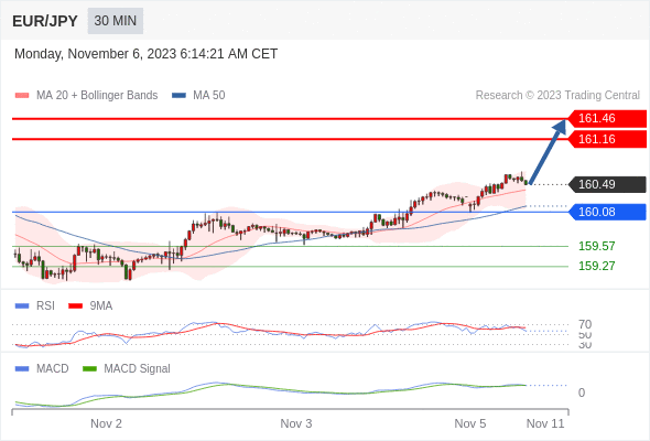 欧元/日元 当日内: 看涨,当 160.08 为支撑位,目标定在161.46。