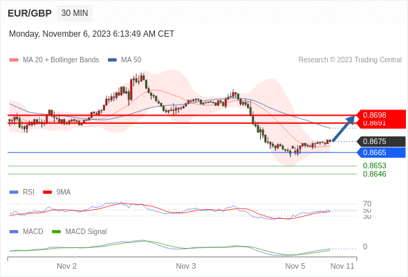 欧元/英镑 当日内: 有上涨的可能,目标价位定在 0.8698 。