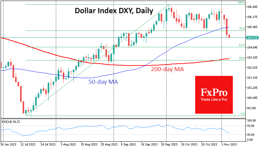 十二月份的进一步加息降低的可能性对美元不利。上周五,美元指数跌至近六周的最低值。12月进一步加息的可能性降低对美元不利。上周五,美元指数跌至六周以来的最低水平。周五的大幅下跌让我们看到了一个更经典的修正模式的转变,从最初的从99到107的反弹回61.8%或104的水平,之前一个月维持在76.4%的修正范围内,支撑位在105.2之上。