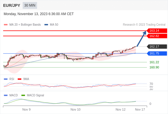 欧元/日元 当日内: 看涨,当 161.75 为支撑位。