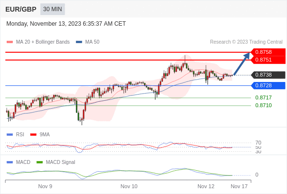 欧元/英镑 当日内: 调整至 0.8728 处,在反弹上升之前。