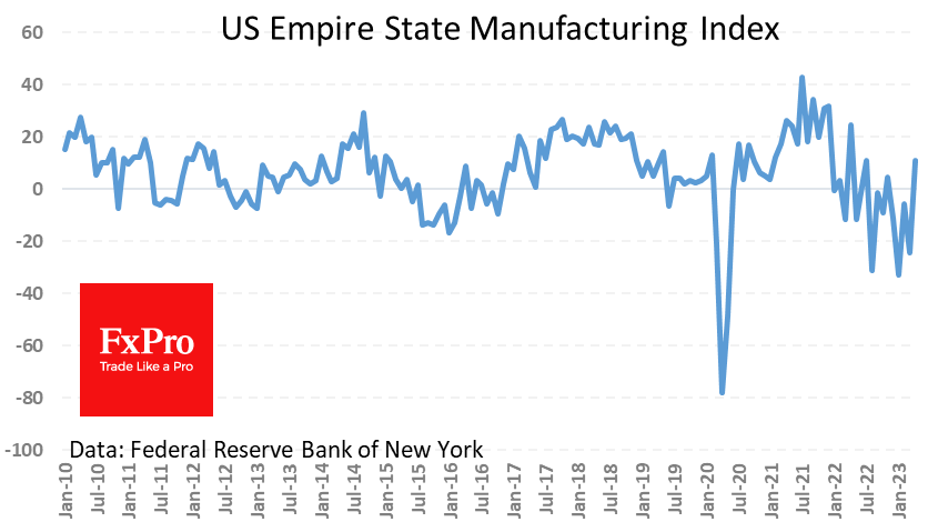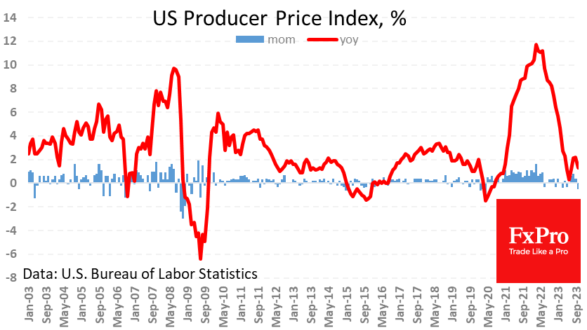 FxPro高级分析师Alex Kuptsikevich指出:生产者价格指数下降0.5%,而预期为上升0.1%。在前一天发布的消费者价格指数之后,这一报告比预期的要弱。年通胀率从2.2%降至1.3%,低于1.9%的预期。不包括食品和能源的核心指数与上月基本持平,年增长率从预期的2.7%降至2.4%。如果市场前一天没有反应过度,这样的报告可能会鼓励新的美元卖家和风险资产买家的进入。