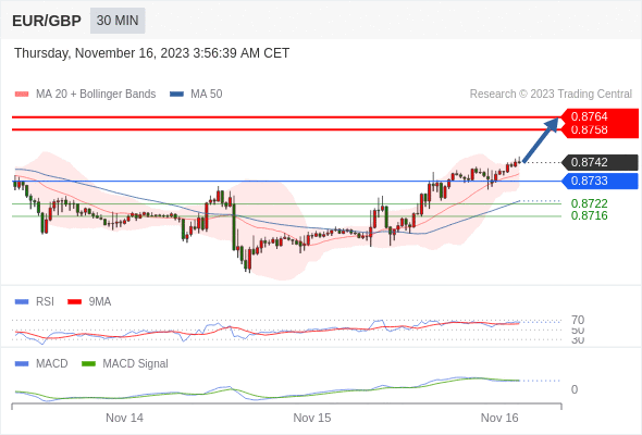 欧元/英镑 当日内: 看涨,当 0.8733 为支撑位,目标定在0.8764。