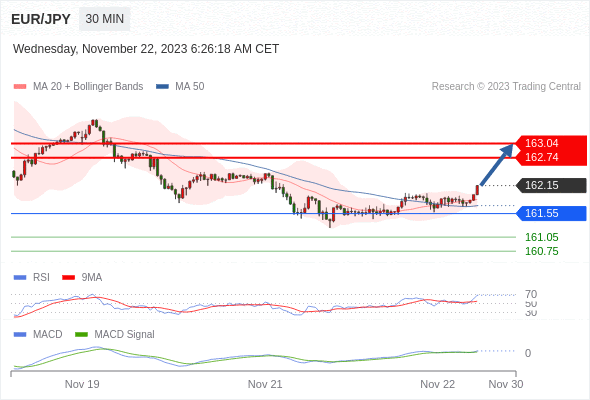 欧元/日元 当日内: 看涨,当 161.55 为支撑位。