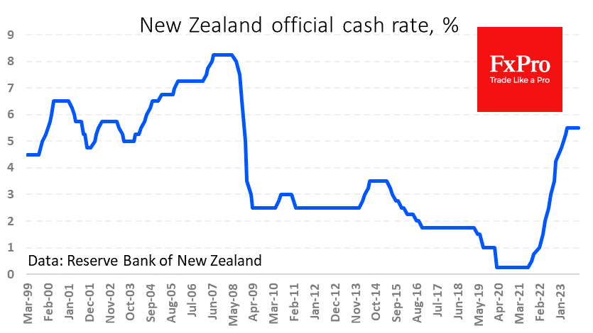 新西兰储备银行(Reserve Bank of New Zealand)将关键利率维持在5.5%不变(这是15年来的最高水平),但目前已经维持了6个月。这一决定符合市场预期。然而,纽元兑美元反弹,涨幅超过1.2%,触及4个月高点0.6200。这种购买冲动来自于央行口头上准备在必要时加息。新西兰央行的利率预测变得更加强硬,证实了愿意采取行动的意愿。该委员会修改了八月份预计一年后的利率将高于目前的水平的预期,最新预期与央行最新的“更长时间维持较高利率”的口号相吻合。